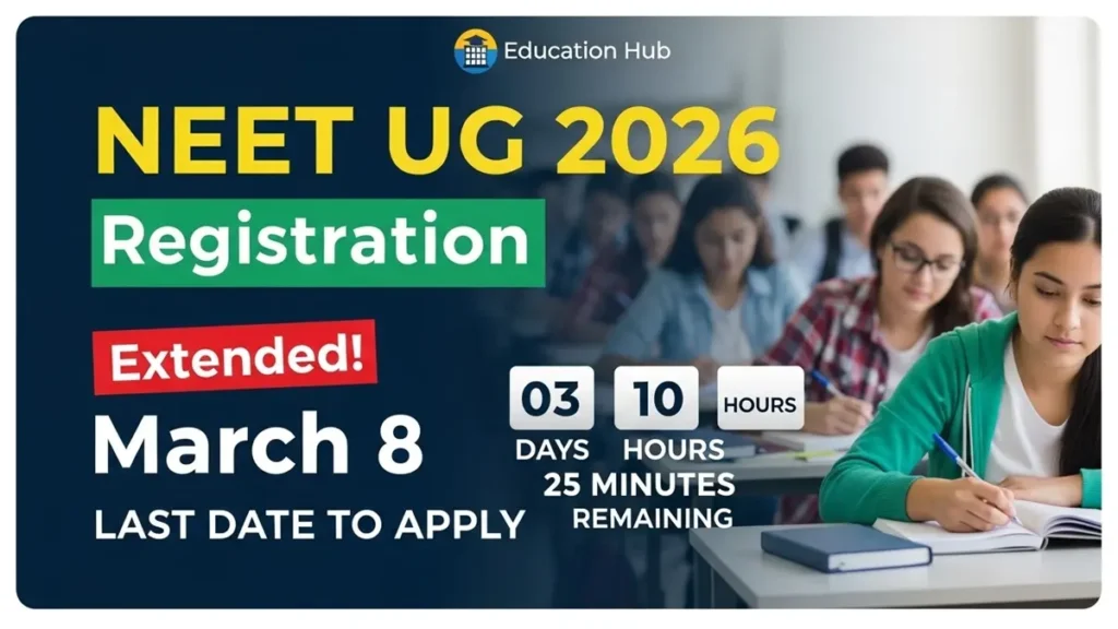 NTA ने NEET UG 2026 के लिए पूरा Schedule जारी कर दिया है। Online Registration 8 फरवरी से शुरू होकर 8 मार्च 2026 रात 9 बजे तक चलेगी। Candidates को Application Form भरने के बाद Fee Payment भी इसी Date तक Complete करनी होगी।